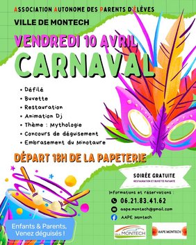 L'Association Autonome des Parents d'élèves organise le carnaval des enfants le vendredi 10 avril : rendez-vous tous déguisés à 18h à la papeterie pour le défilé jusqu'à la salle Laurier.