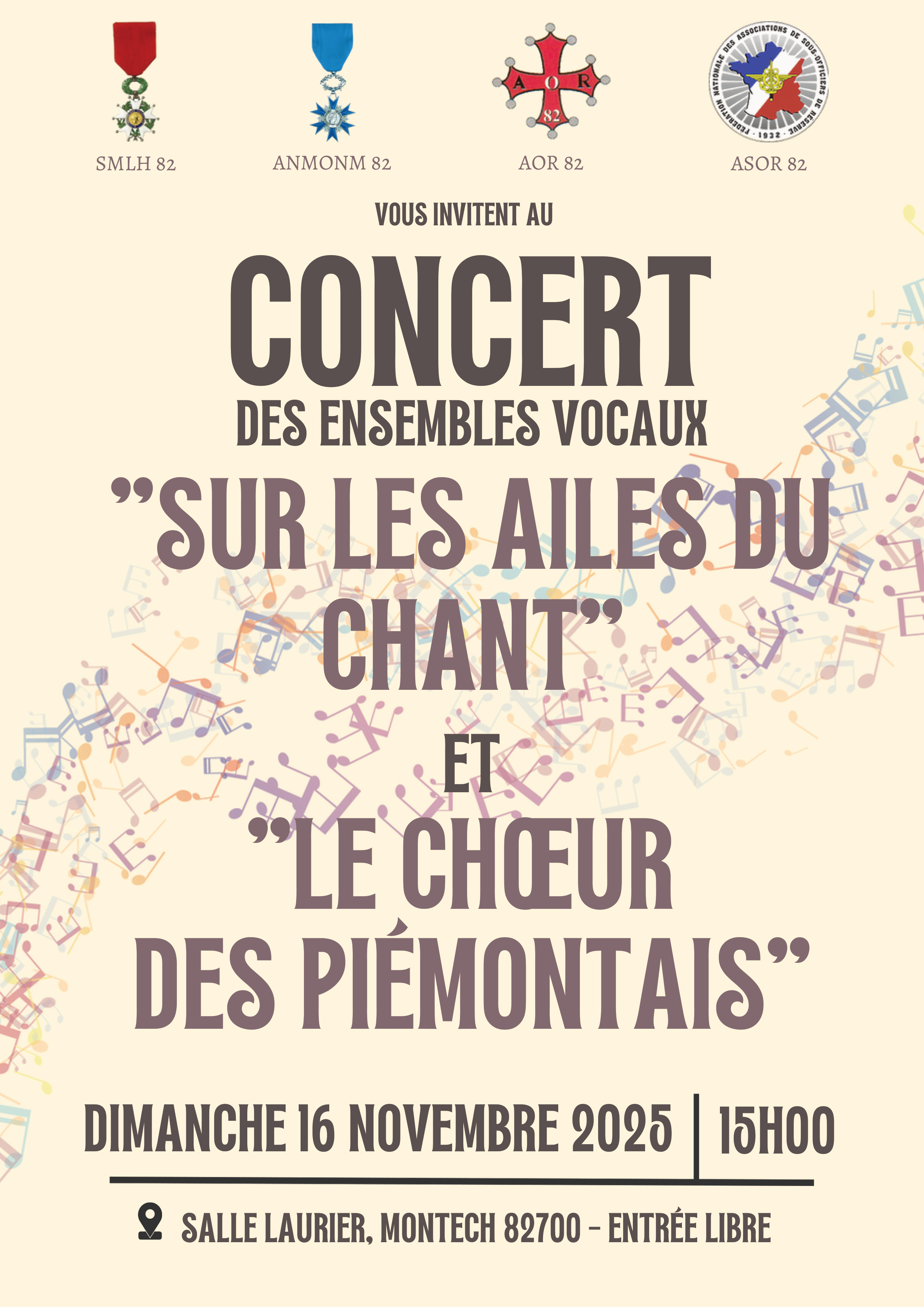 Deux ensembles vocaux, "Sur les ailes du chant" et "le choeur des Piemontais" se produiront pour vous ce dimanche 16 novembre, à la salle Laurier, à 15h.