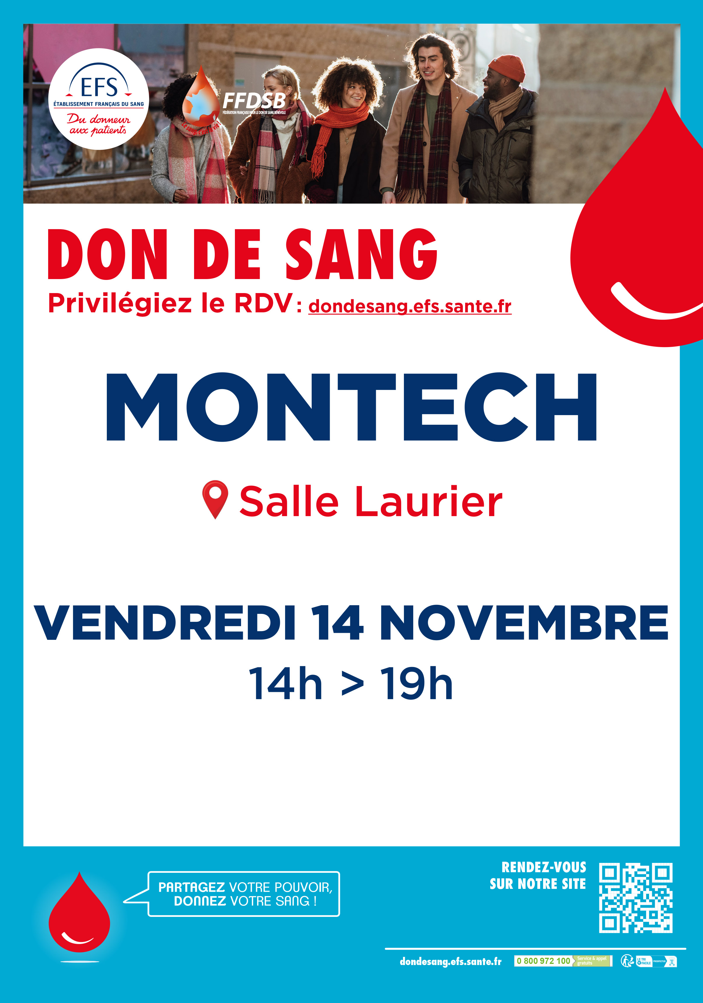 La prochaine collecte de sang qui se tiendra à Montech le vendredi 14 novembre prochain à partir de 14h, salle Laurier.