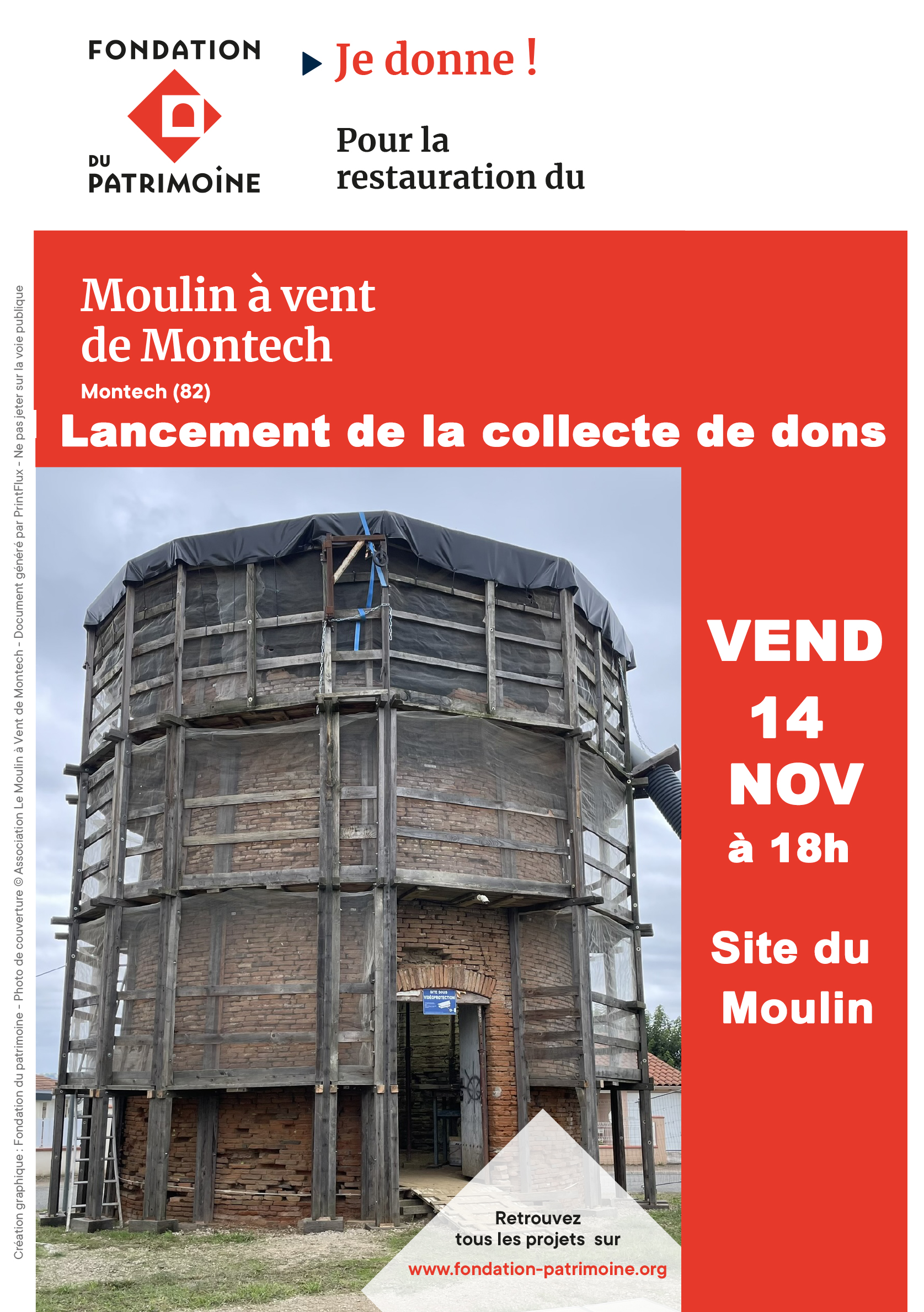 M Dal Sal Soglio, Président de l’association du Moulin à Vent de Montech et son conseil d'administration ont le plaisir de vous inviter au lancement de la collecte de dons pour la fondation du patrimoine pour le compte de l'association, le vendredi 14 novembre à 18h sur le site du moulin.