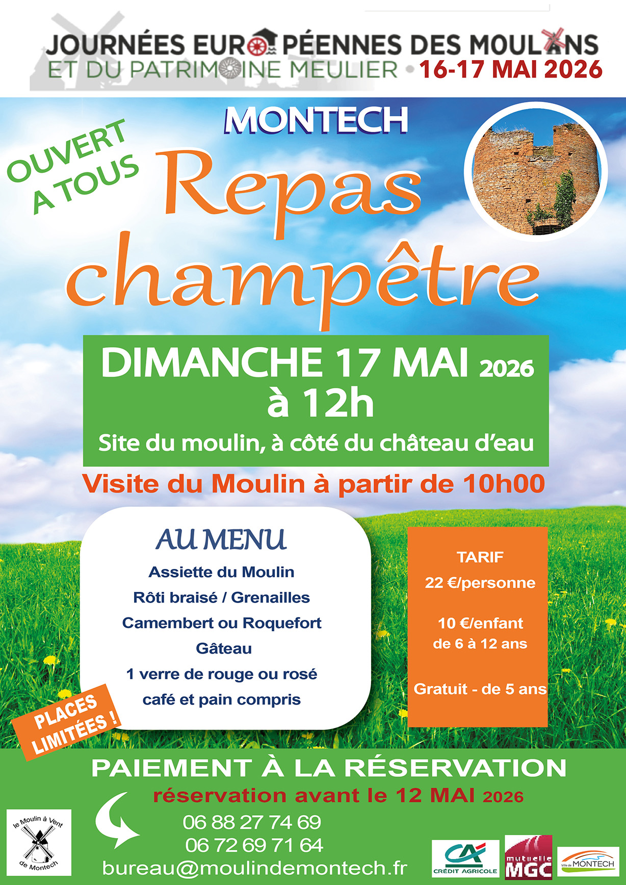 L'association du Moulin à vent de Montech organise, à l'occasion de la journée européenne des moulins et du patrimoine meunier, un repas champêtre à 12h le dimanche 17 mai.