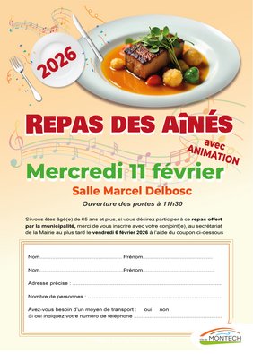 La Municipalité organise pour les aînés de la commune, un repas avec animation musicale, le mercredi 11 février à 11h30, salle Delbosc.
